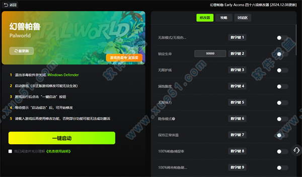 幻兽帕鲁是一款非常热门好玩的3D动作冒险游戏,由Pocketpair开发。在这个奇幻的世界中,玩家将有机会收集各种可爱的帕鲁生物,和它们一起成长与战斗。游戏内有丰富的探索内容、养成系统和战斗挑战,画质精美,玩法多多,非常具有挑战性。有了这款幻兽帕鲁风灵月影四十六项修改器,我们就可以更为轻松的享受游戏乐趣了,喜欢的朋友快来本站下载体验吧!2、启动游戏。
