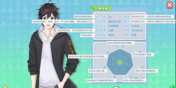 3、分配精力来决定自己的发展路线,将影响到游戏中的学习、工作、生活、社交、恋爱等诸多方面