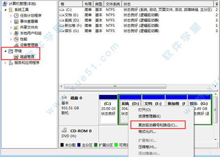 2、选择“磁盘管理”,在打开界面的100M隐藏分区上面选择“更改驱动器号和路径”,为该隐藏分区分配个盘符号(除AB以外的任何字母,不要和其他盘符重复)。