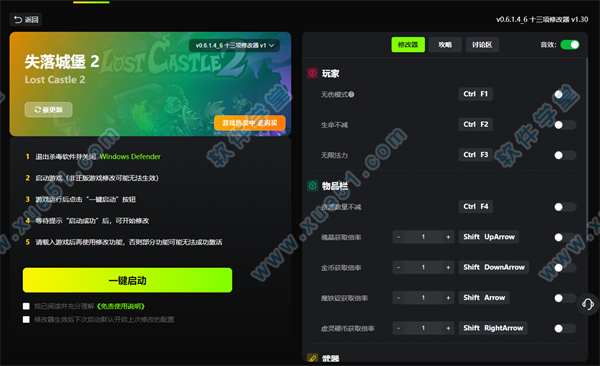 失落城堡2修改器是一款肉鸽游戏修改器,包含了一共13项修改功能,例如无伤模式、生命不减、改变游戏速度、魂晶和金币获取倍率修改等,具体支持的功能列表小编在下文给大家进行了详细的整理,总的来说,这些游戏辅助功能强大又好用,非常适合喜欢这款游戏的玩家。