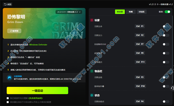 恐怖黎明修改器是一款由风灵月影制作的游戏修改器,为玩家提供了十一项修改功能,如无限法力、无限生命、隐身模式、超级速度等。需要注意的是,这是基于64位版本制作的修改器,请各位玩家在启动时选择64位版本,或执行游戏x64文件夹下的Grim Dawr。