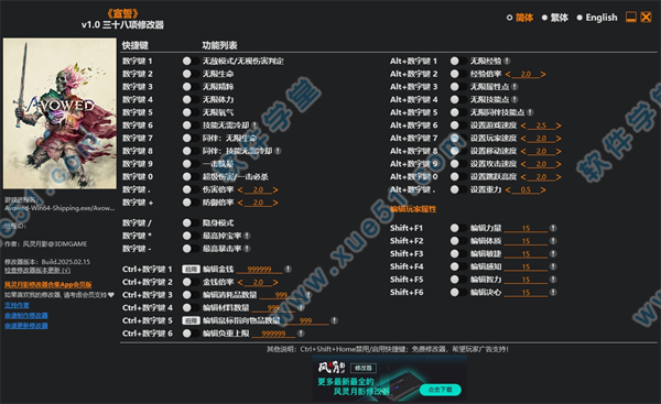 宣誓修改器是一款角色扮演游戏修改器,由风灵月影针对这款游戏制作,为玩家提供了三十八项强大的修改功能,例如隐身模式、无敌模式、无限生命、无限精粹、无限氧气、最高暴击率、编辑玩家属性、无限同伴技能点等,降低玩家游戏的难度。
