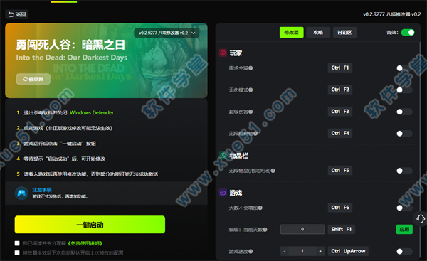 勇闯死人谷暗黑之日修改器是勇闯死人谷:暗黑之日玩家必备的一款游戏修改器,它提供了共计八项好用的修改功能,例如无限物品、无伤模式、需求全满、编辑当前天数等,让玩家可以在游戏内更轻松地生存下来,并且不容易死亡。