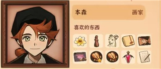 11、本森,喜欢的物品有金色兰花、火山女神木雕、香香的毛巾、山羊、本森肖像、烧烤龙虾肉、魔神药水、《绘画主题表现》