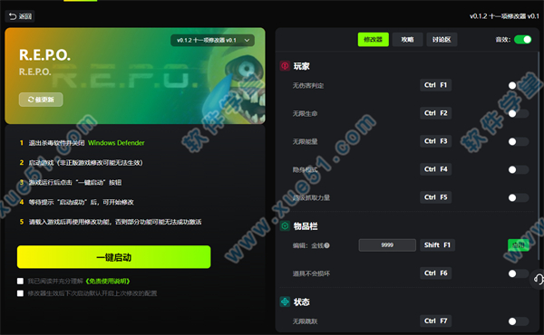 r.e.p.o.修改器是一款闹鬼题材冒险游戏修改器,提供了十一项强大的修改功能,其中隐身模式让你不会被鬼魂发现,无限生命让你可以肆无忌惮地在各种危险场景中探索,还有无限能量、超级抓取力量、道具不会损坏、移动速度倍率等超多好用的功能等你来解锁,让你能够体验超多花样玩法。喜欢这款游戏的小伙伴们不要错过,快来软件学堂下载r.e.p.o.修改器使用吧!