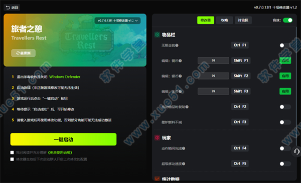旅者之憩修改器风灵月影版是一款模拟经营游戏辅助工具,让玩家能够轻松愉快地体验各种经营玩法。本修改器涵盖了十项功能,如无限金钱、动作瞬间完成、壁炉燃料不减、拖动物品时复制、铜币/银币/金币编辑等功能,让大家可以休闲舒适地体验旅者之憩游戏。它的界面非常简洁直观,使用操作便捷,运行稳定,兼容性也很好,有需要的朋友可以自行在本站下载旅者之憩修改器使用。