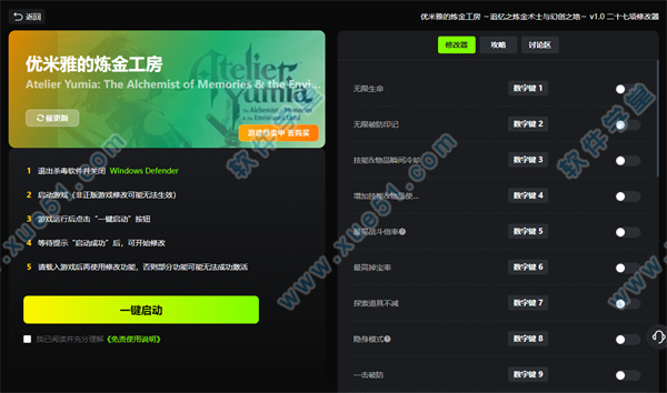 优米雅的炼金工房修改器是专为优米雅的炼金工房追忆之炼金术士与幻创之地游戏制作的一个修改器辅助工具,它为玩家提供了二十七项强大的游戏辅助功能,例如无限破防印记、无限生命、探索道具不减、隐身模式、增加技能&物品使用次数、最高战斗倍率等,让大家能够在这款开放世界RPG游戏里享受到更加轻松的冒险体验,有兴趣的朋友欢迎前来本站下载这个优米雅的炼金工房修改器使用吧!