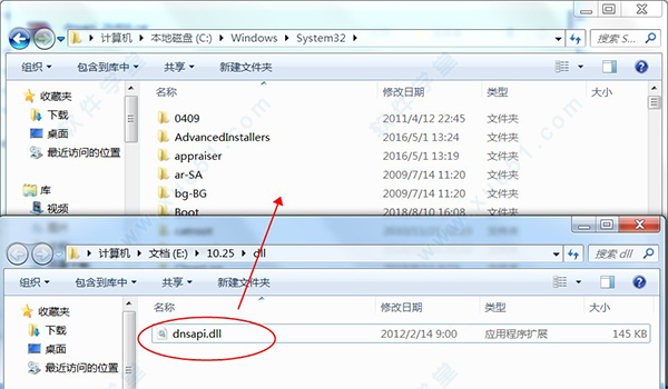WindowsXP/WIN7系统,(64位系统对应64位dll文件,32位系统对应32位dll文件)将dnsapi.dll复制到C:WindowsSystem32目录下