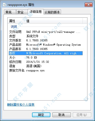 raspppoe.sys是raspppoe宽带拨号软件中的一个重要的系统文件,专门用于解决win7宽带连接651错误代码问题的工具,将它放在系统文件夹下,可以用效的解决宽带连接错误651的问题。它利用windows原有的拨号网络,增加对Point-to-Point Protocol Over Ethernet(PPPOE)通讯协定的支持,让你直接用拨号网络就能用ADSL连上网络。缺少它软件将无法正常拨号上网,当你软件中缺少该文件无法正常使用时,不用担心,本站在这里为用户提供raspppoe.sys win7 64位&32位两个版本的sys文件下载端口,欢迎有需要的朋友免费下载体验。