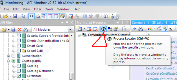 2、然后运行apimonitor-x86.exe,如下图所示,定位要监视的应用程序