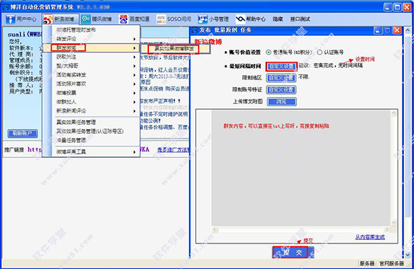 点击菜单 新浪微博、腾讯微博,选择“群发微博”→“高质量群发微博”