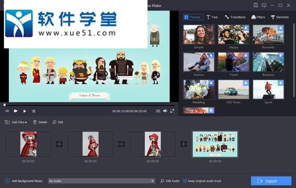 Slideshow Maker提供10种常用的幻灯片主题供您选择,如快乐,浪漫,时尚,旅游,婚礼,圣诞节,运动等。您可以选择自己喜欢的或逐个尝试,直到找到合适的主题。