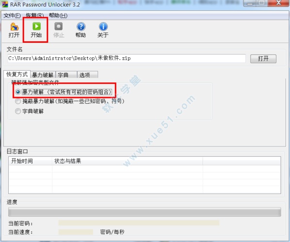 1、“打开”按钮选择要破解的WinRAR文件。然后选择其中一种破解类型,当我们对密码信息一无所知时,小编建议选择“暴-力-破解”项,最后点击“开始”按钮正式进入破解过程