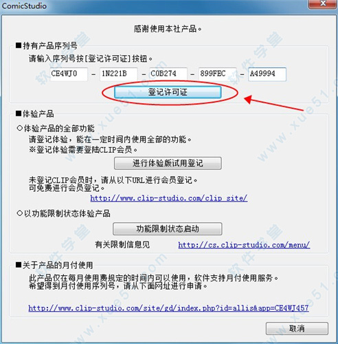 5、打开CS_EX.exe,跳过素材安装,输入序列号:CE4WJ0-1N221B-C0B274-899FEC-A49994,序列号输入完成后,点击“登记许可证”