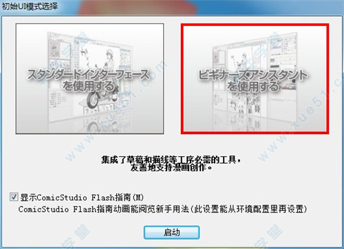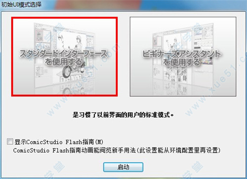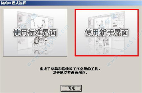 1、初始ui模式选择comic studio初次启动后会弹出【初始ui模式选择】窗口,并提供两种软件界面的选择:【使用标准界面】与【使用新手界面】。