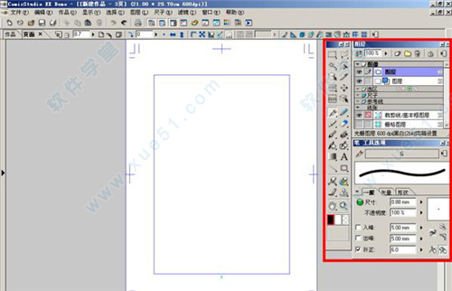 comic studio拥有多种功能面板,但平时使用较多的只有【工具箱】、【图层】、【工具选项】这3个。将左侧最大的面积分配给工作页面。