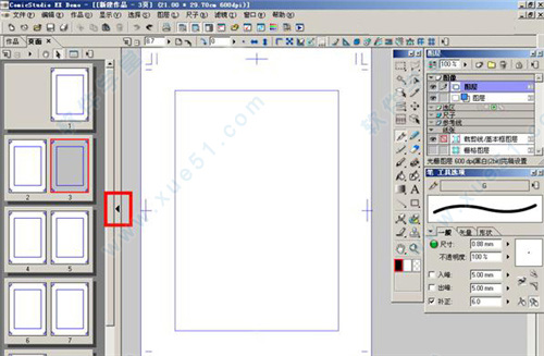 5、显示【页面列表】工具与自定义工具箱如果新建的是多页的【作品】页面,单击comic studio窗口左侧的“黑三角”会显示或隐藏【页面列表】栏。双击【页面列表】中的缩略图,就会在工作区打开所选的页面。【页面列表】可直观地显示漫画版式、页数、所选页面等信息。