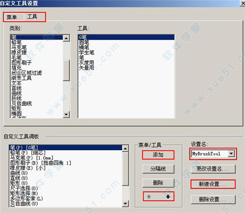 8、设置自定义工具为了避免查找工具的麻烦,comic studio提供了自定义工具箱的功能。