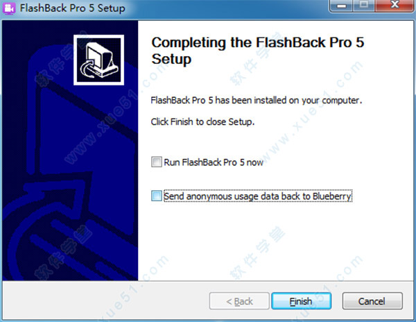 7、软件BB FlashBack Pro 5安装完成,去掉方框内的勾“√”防止软件自动运行打开,这对下面进行破解很重要,最后点击“finish”退出安装程序即可