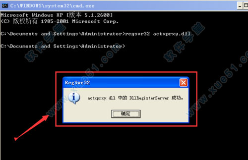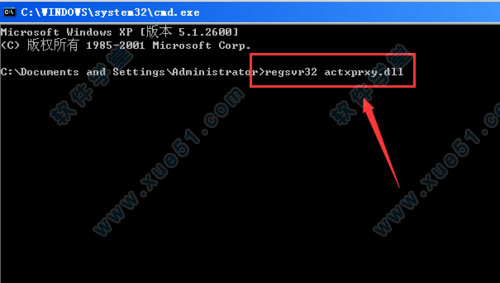 2、在cmd命令行中输入regsvr32 actxprxy.dll ,就可以重新注册 actxprxy.dll文件了。
