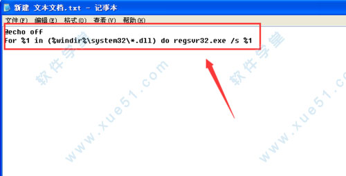 3、上图为dll修复成功了。那么如何对系统中所有的dll文件进行批量修复了。打开记事本,在其中写一段代码。for %1 in (%windir%\system32\*.dll) do regsvr32.exe /s %1。