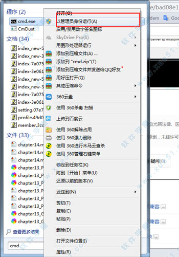 3、然后点击开始菜单,在其中输入cmd,不要回车,这是后在出现的结果中,右键点击以管理员身份运行,如果直接进入,执行后续步骤会报错。