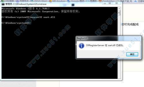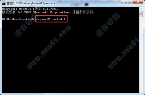 4、在系统窗口中输入regsvr32 oart.dll命令,回车即可完成配成。