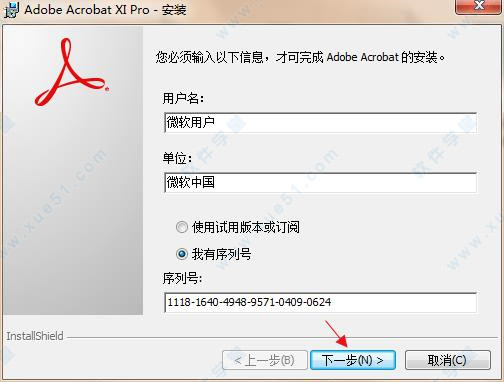 4、选择”Adobe Acrobat 11 Standard”,输入注册机第二行的序列号并按”下一步”