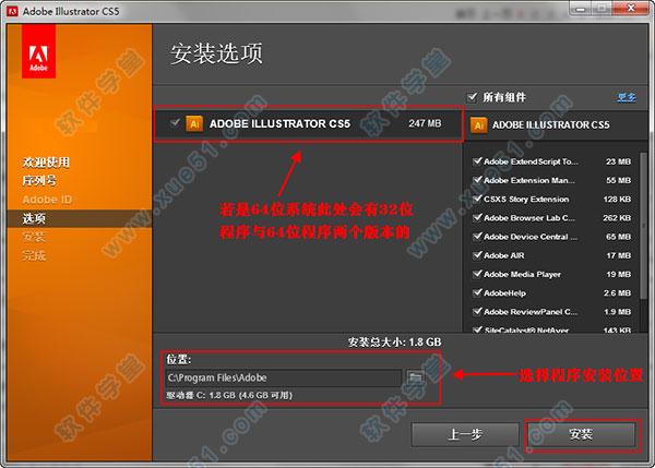 5、接下来就进入安装内容界面了,由于小编的系统为32位,下面的图则只有一个安装选项,若是64位系统的朋友则会有32位与64位两个安装内容,可选择都安装也可只安装一个。