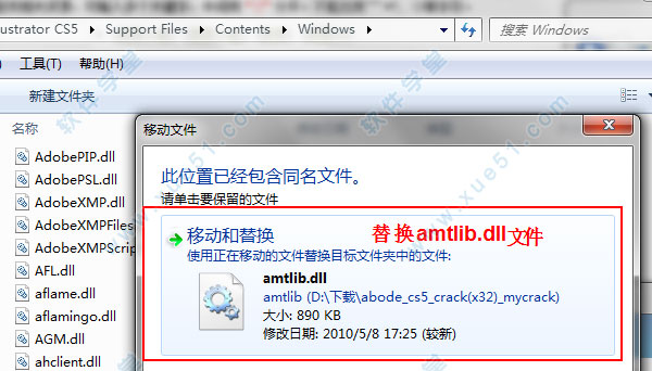 11、找到Adobe Illustrator CS5程序安装文件夹中的amtlib.dll文件,这个文件一般在安装盘符中的X(X代表你的程序安装盘符):Program FilesAdobe Illustrator CS5Adobe Illustrator CS5Support FilesContentsWindows中,用通用破解补丁将这个文件替换掉。