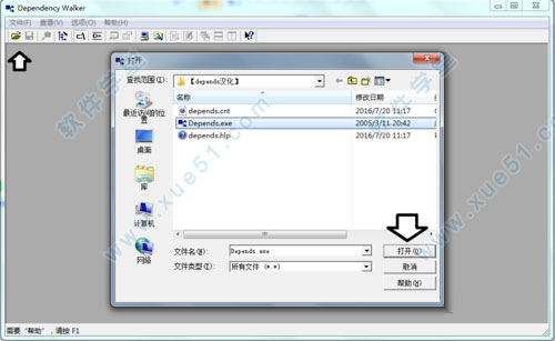 2、也可以点击工具栏上的文件→打开,找到需要分析的exe可执行文件即可,这里就点击Depends.exe可执行文件进行分析(可执行文件格式,包括 DLL、EXE、FON)。