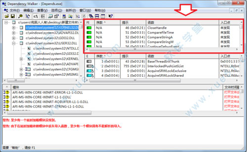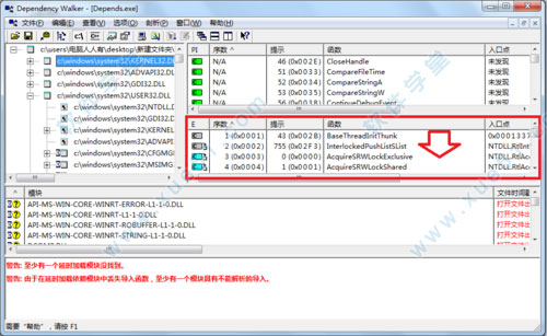 4、点击一个dll动态链,右边就会出现两个窗口。第一个窗口是所选的Dll模块所使用的函数,分为:序数、提示、函数、入口点等讯息。
