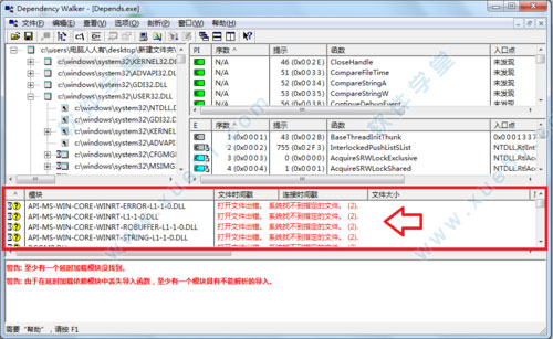 通过Depends.exe查看程序依赖库1、首先打开exe文件夹,将要分析的文件拖入其中,这时文件夹会自动分析该文件的依赖库。入下图红圈内所列出的依赖的系统.dll。如果某个.dll缺失会出现红色的标记。