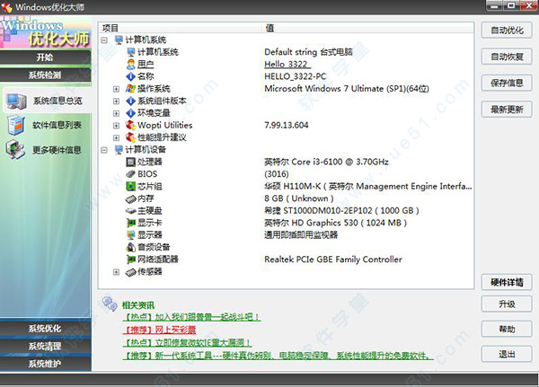 一、详尽准确的系统信息检测。深入系统底层,分析用户电脑,提供详细准确的硬件、软件信息,并根据检测结果向用户提供系统性能进一步提高的建议。