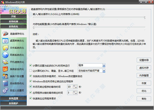 3、切不可任意调整 CPU二级缓存。与此有关联的是:在 windows 的“系统”中调整缓存 时,从“开始”、“控制面板”、“系统”、“高级”、“性能设置”、“高级”之“内存使用”项中,只可选“程序”,不可选“系统缓存”,否则将出现上述第二忌中的同样现象,要*系统还原来予以复原。由上可知,windows优化大师在高配置电脑中能起的作用,已远不如低配置电脑,这是完全可以理解的,而且要注意不可误用。但优化大师在系统性能测试,圾垃及冗余文件清理等方面的作用还是很有用的,任不失为一个有价值的优化软件。