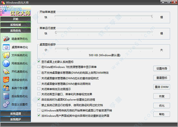 3、桌面图标缓存:建议将该值调整到768KB。 同时,您还可时选中"加速Windows刷新率"、"关闭菜单动画效果"、"关闭开始菜单动画提示"3个选项,这也有助于加速您的Windows。