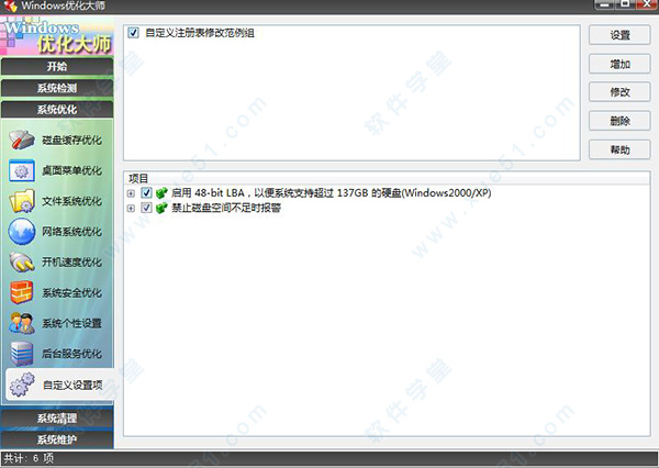 二、全面的系统优化选项。磁盘缓存、桌面菜单、文件系统、网络、开机速度、系统安全、后台服务等能够优化的方方面面全面提供。并向用户提供简便的自动优化向导,能够根据检测分析到的用户电脑软、硬件配置信息进行自动优化。所有优化项目均提供恢复功能,用户若对优化结果不满意可以一键恢复。
