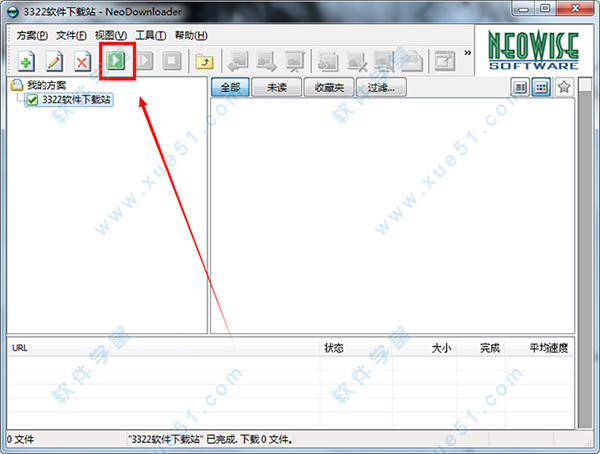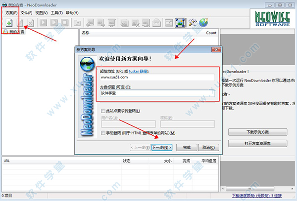 1、解压数据包,用鼠标双击“NeoDownloader.exe”打开软件,进入软件界面,新建方案,输入网址。