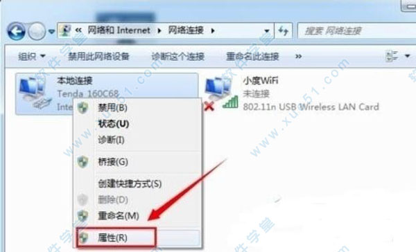 3)之后弹出的窗口中会包含所有已创建的网络,我们使用鼠标右键单击“本地连接”,然后使用鼠标左键点击选择“属性”。