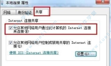 4)之后在打开的“本地连接属性”窗口中,先切换至“共享”标签页。将其中的“允许其他网络用户通过此计算机的Internet连接来连接”选项单击勾选上,并确定修改。这样就能成功解决了,快来试试吧。