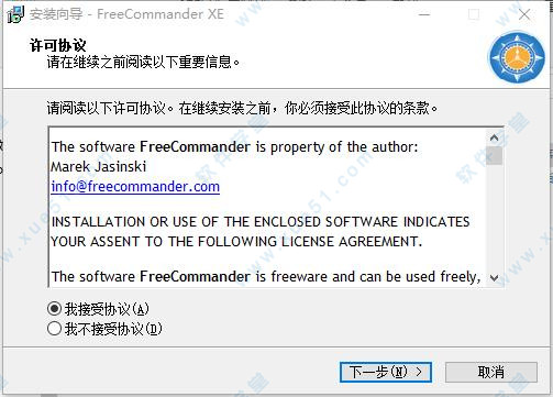 1、在本站下载好FreeCommander 2019 64位文件包,解压之双击主程序运行,在许可协议界面,选择“我接受协议”,点击“下一步”。