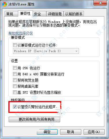 1、开始之前,请进入程序的默认按住路径D:V8,然后鼠标右键点击“冰焰V8.exe”,弹出窗口点击“兼容性”,在特权等级栏勾选“以管理员身份运行此程序”