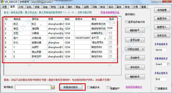 5、要使用自动登录功能的,就按要求输入下账号密码,保存修改,勾选要上的号,点自动登录,脚本就会依次自动上号了,上号失败的都是没设置好。不存谁谁谁在上不去的情况,实在不会弄,找客服帮你