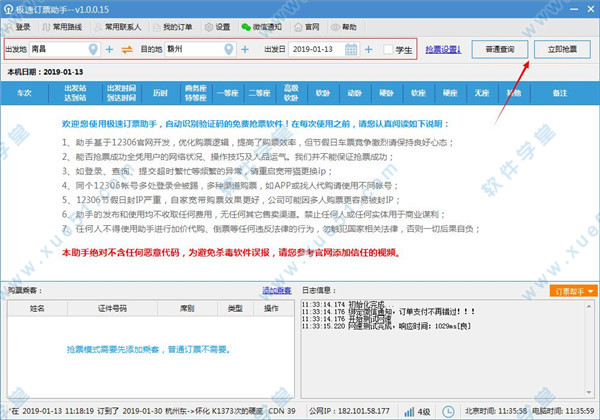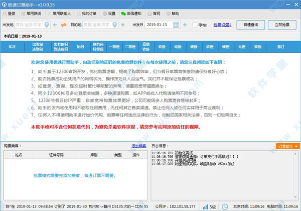 12306极速订票助手绿色电脑版,程序已经完美集成绿化免去了繁琐的安装过程可直接打开使用,并以电脑客户端的形式展现在你的面前你将拥有一个更加舒适的体验。