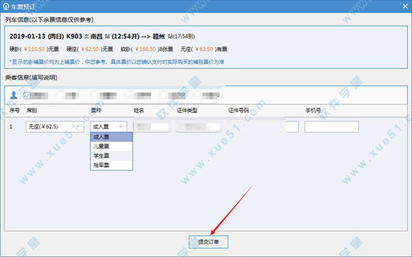 5、进入到最后的确认界面,在这里选择好需要乘坐的用户、席别、票件等,然后点击【提交订单】即可完成车票的订购。
