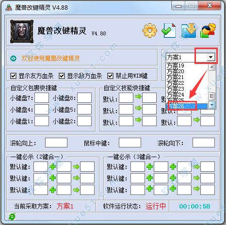 4、定义快捷键完成后,点击“保存”即可将当前定义按键保存到方案1,接下来运行魔兽游戏,通过反复按“Scroll(Pause)”可实现魔兽改键精灵的启动和停止操作。