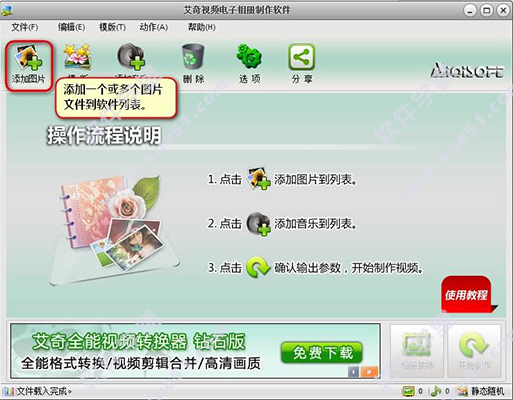 1、运行艾奇视频电子相册制作软件后,单击“添加图片”按钮,选择制作电子相册所需要的图片文件导入到软件列表中,如下图所示。