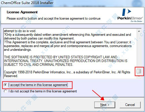 3、将右侧的进度条拉到底,选择“I accept the terms in this license agreement”然后点击next。