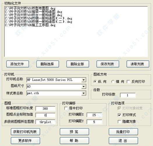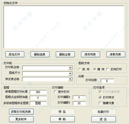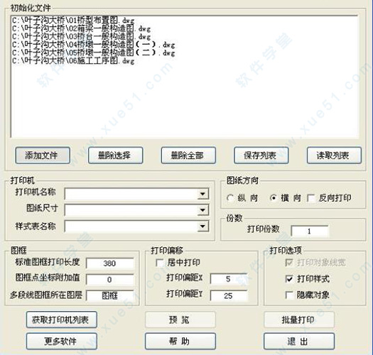 4、点击获取打印机列表按钮,将把CAD中的打印机名称全部添加到打印机名称下拉框,选取图纸尺寸、样式表、图纸方向及打印份数等。