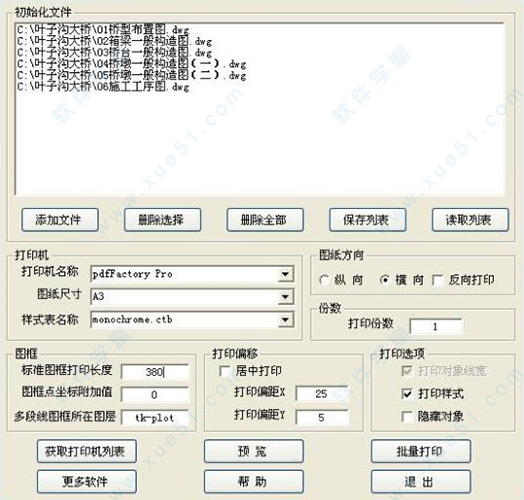 图框点坐标附加值,举例说明:标准图框多段线宽度为1.2,图框点坐标附加值为0时,程序打印后的宽度为标准图框多段线宽度的一半,即1.2/2=0.6;标准图框多段线宽度为0.9,图框点坐标附加值为0时,程序打印后的宽度仅为0.9/2=0.45,如要求标准图框的打印宽度为0.6,图框点坐标附加值为0.6-0.45=0.15。